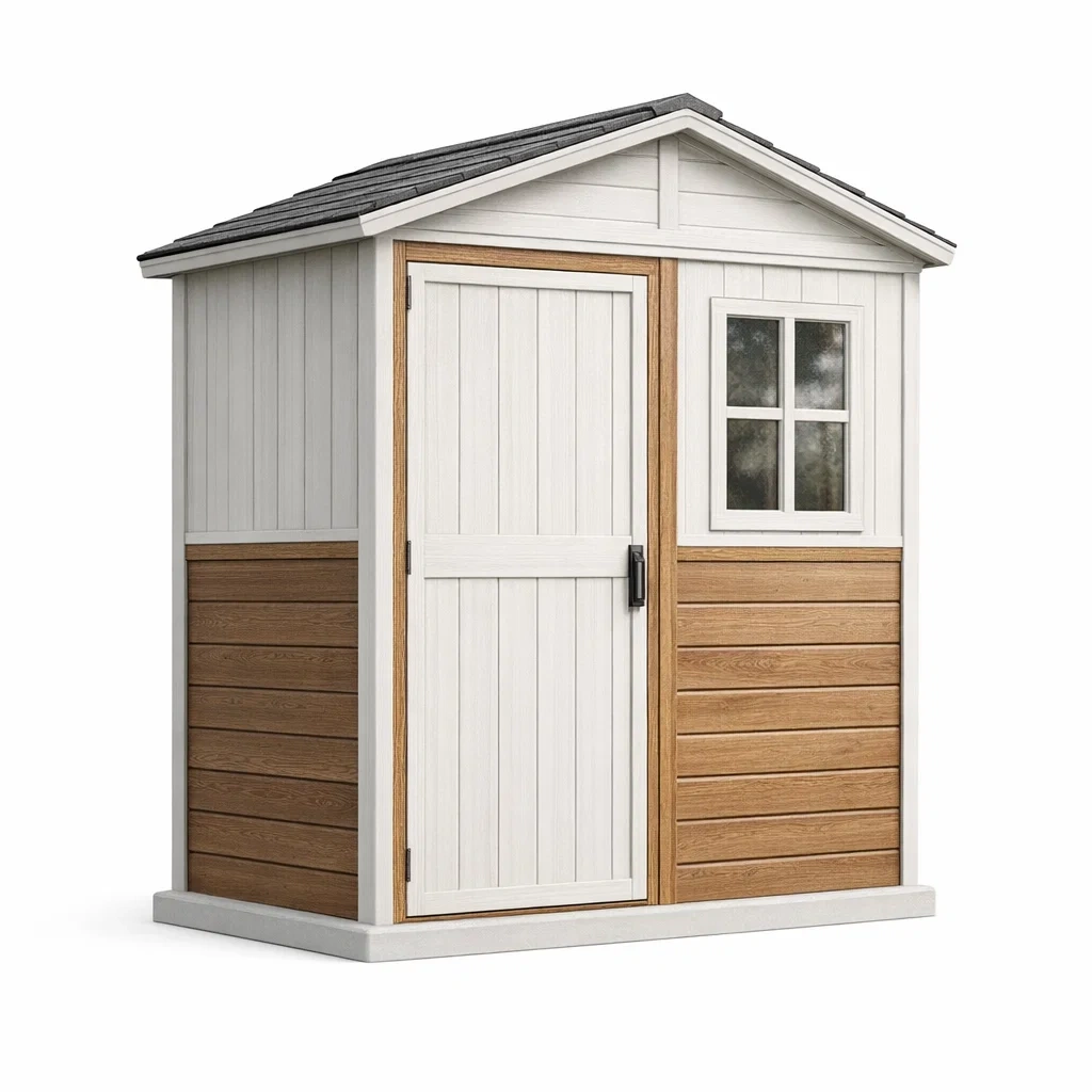 Casetta da giardino in resina bianco e legno con porta e finestra