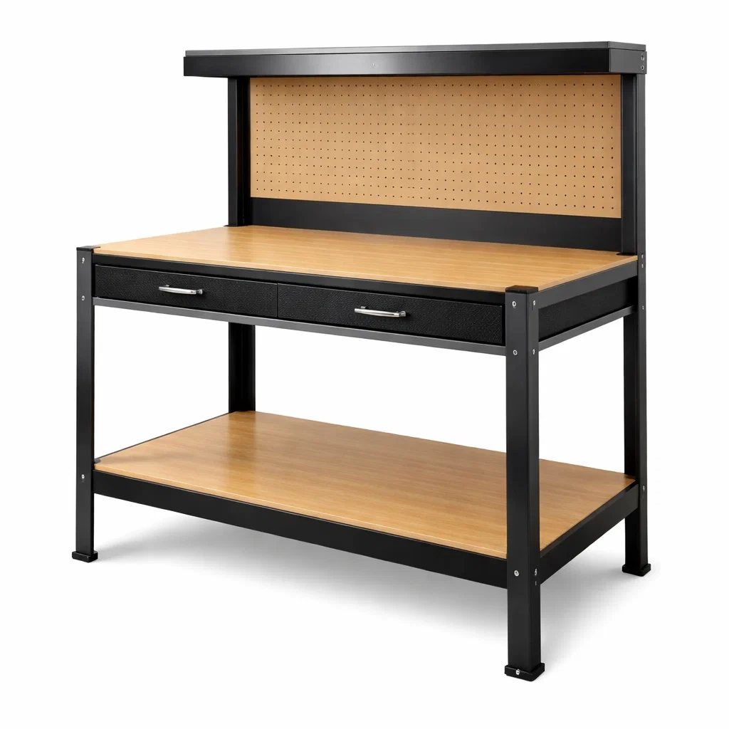 Il banco da lavoro ha una struttura in metallo e una superficie in MDF rifinita con laminato in legno naturale. Presenta un pannello forato per utensili e due cassetti. Le dimensioni complessive sono: altezza 150 cm, larghezza 120 cm, profondità 60 cm. La capacità di carico è di 200 kg.
