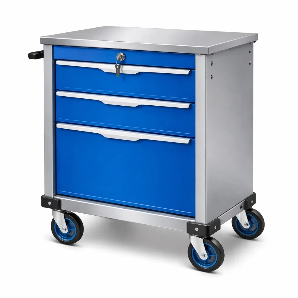 Carrello portautensili in acciaio con 3 cassetti blu e ruote