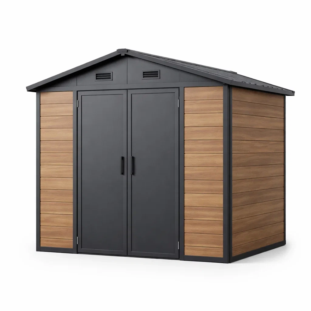 La struttura è realizzata in acciaio con pannelli effetto legno e porte in acciaio. Misura 180 cm di lunghezza, 200 cm di larghezza e 190 cm di altezza, con un peso di 150 kg. Il colore è marrone e nero. Include maniglie e ventilazione integrata. Spazio di archiviazione esterno resistente alle intemperie.