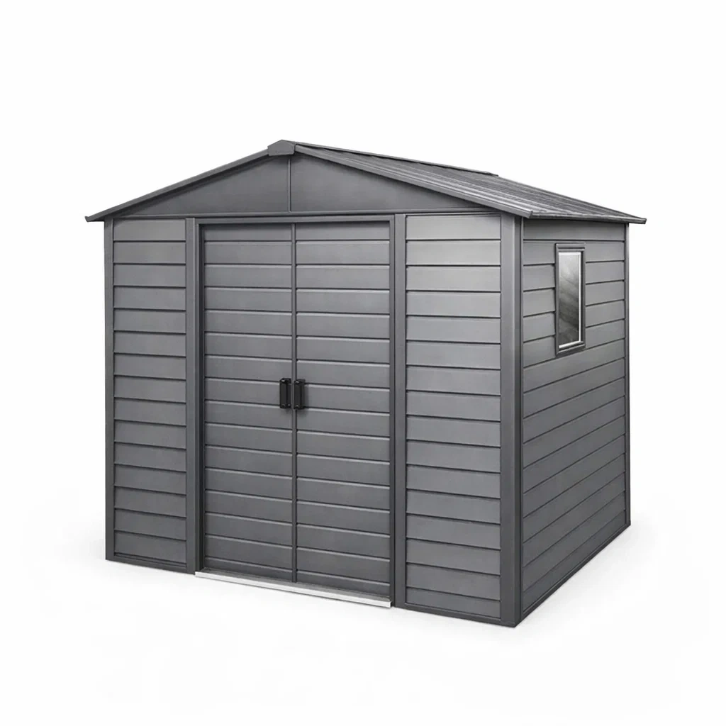 Capanno da giardino realizzato in acciaio zincato con rivestimento anti-corrosione. Le dimensioni sono 300 cm di lunghezza, 200 cm di larghezza e 210 cm di altezza, per un peso netto di 150 kg. Verniciato in colore grigio, è progettato per l'uso esterno e offre resistenza agli agenti atmosferici grazie alla sua impermeabilità. Dotato di una finestra per la ventilazione e serratura per la porta. Viti e supporti inclusi.