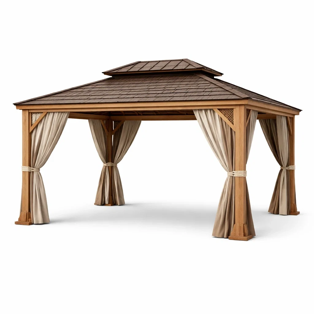 Struttura in legno di abete, tetto in tegole di poliuretano, tende in poliestere.