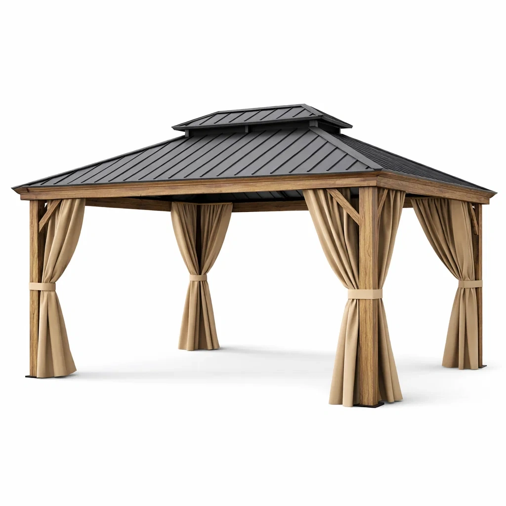 Il gazebo è realizzato con una struttura in legno massello e un tetto in pannelli di acciaio zincato. Le tende sono in poliestere resistente.