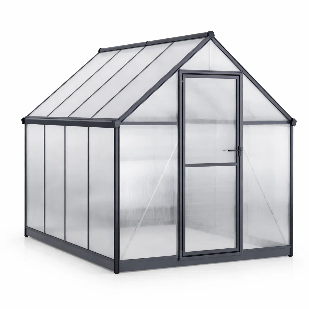 Questa serra è realizzata con una struttura in alluminio e pannelli in policarbonato trasparente. La porta è a battente e il tetto a spiovente offre resistenza alle intemperie. Include una finestra di ventilazione per il controllo della temperatura interna.